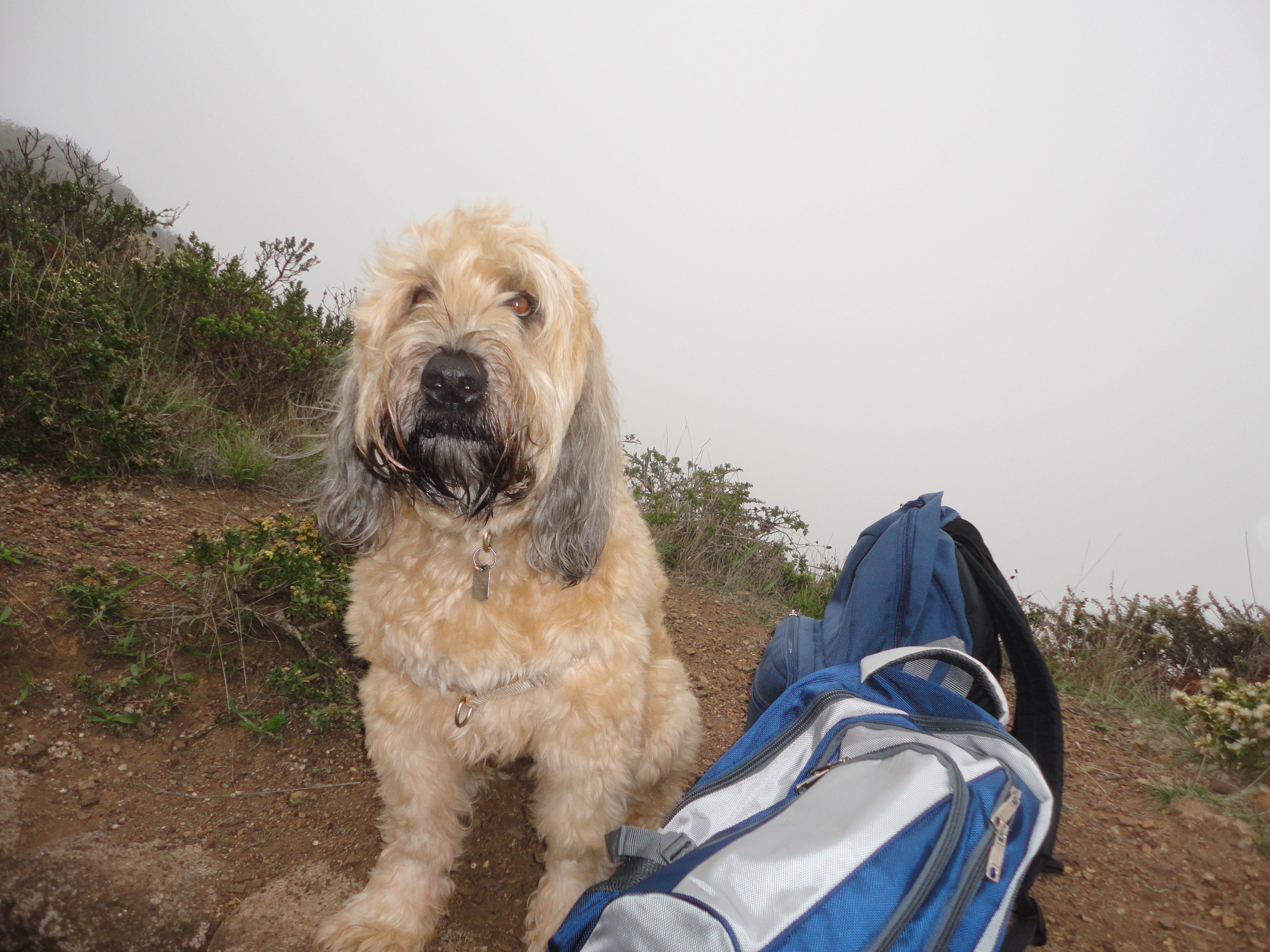 It was a bit mysterious because visibility was very low, often just a hundred yards or so. (I’m glad it was cool – warm weather can slow me down.) The dense fog blocked out the horizon, and the normally beautiful views of the nearby hills and ocean were greyed out. But we could see the path and I was an exemplary leader, showing the way and scouting for any critters and interesting smells (found no critters and only a few good smells). I looked back often, was welcomed by the people we met, and didn’t disturb the environment. (We crossed paths with 10-12 school groups of 12-15 including instructors, from the Headlands Institute.)